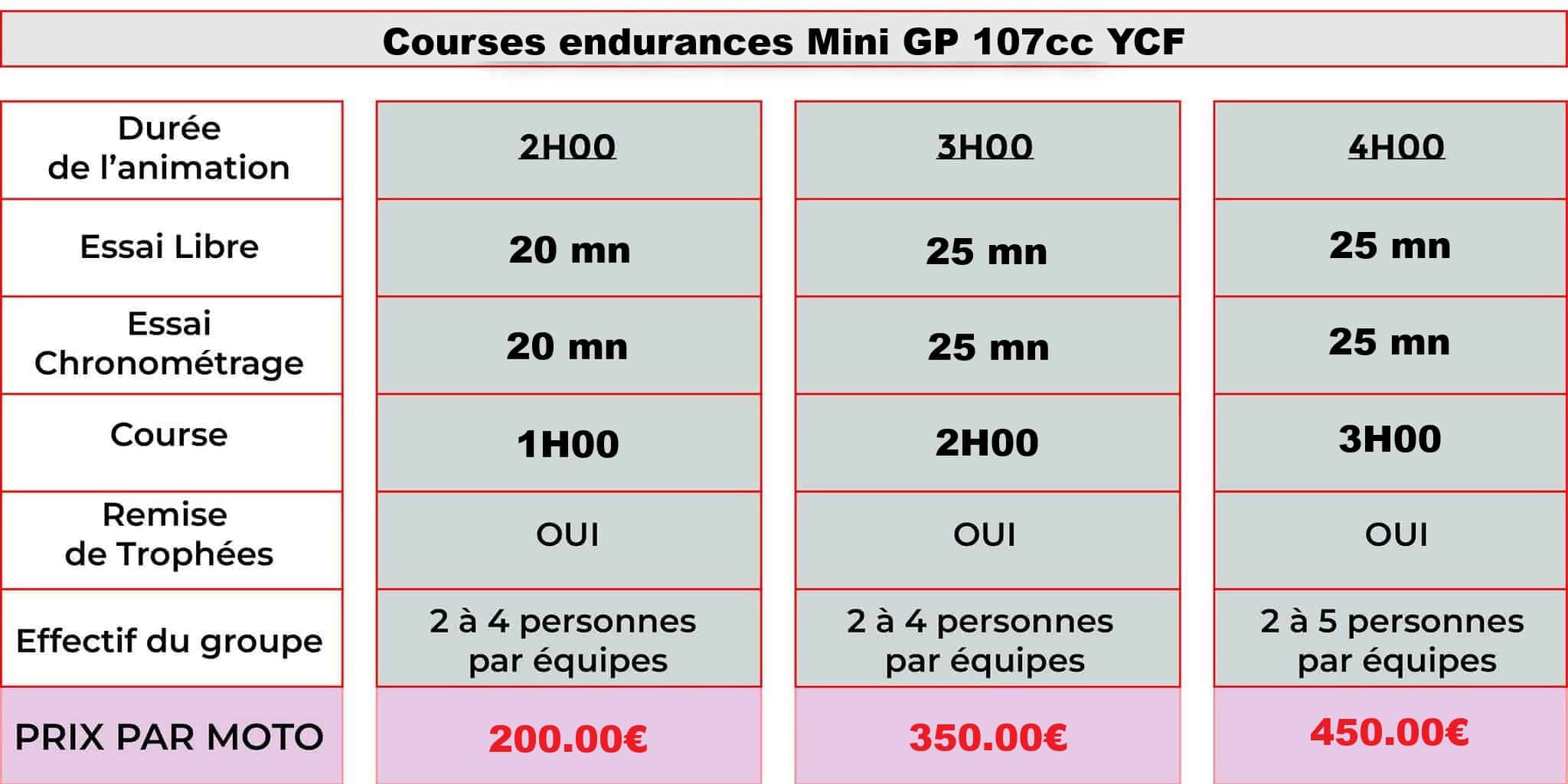 Course Moto – Endurance & Individuelle COURSE DE MOTO INDIVIDUELLE ET D'ENDURANCE Découvrez nos formules individuelles ou d'endurance motos(16 ans minimum) Groupe de MINIMUM 8 personnes à 14 MAXIMUMLe roulage s’effectuera sur la totalité du circuit ATTENTION Le durée de l’animation ne correspond pas au temps de roulage, mais à la durée de la formule. Chaque moto sera sous-caution. × N’hésitez pas à nous contacter, un formulaire se situe au bas de la page. Submit